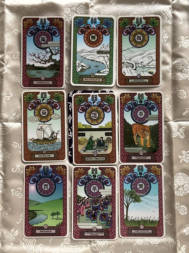本来は一つの卦から翌年の総合的な傾向だけを見る年筮を、九星盤に易占タロットカードを配置して項目の傾向をおみくじ的に知れるようにしています。